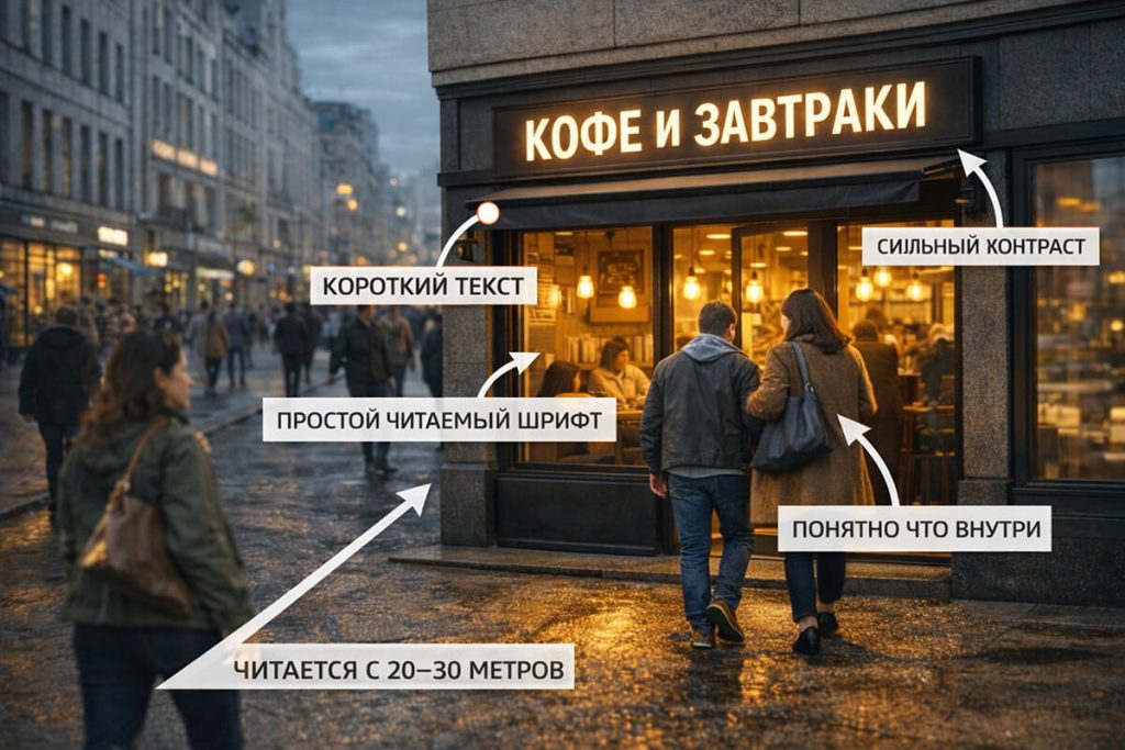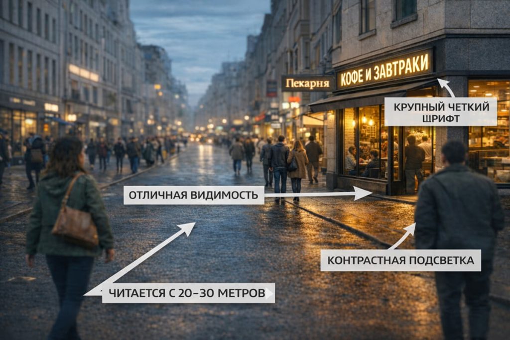 Критерий 3 — контраст и свет. Вывеска одинаково читается днем, в сумерках и вечером.
