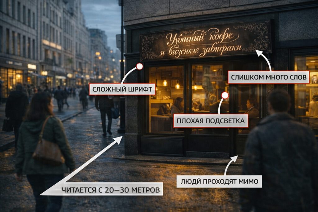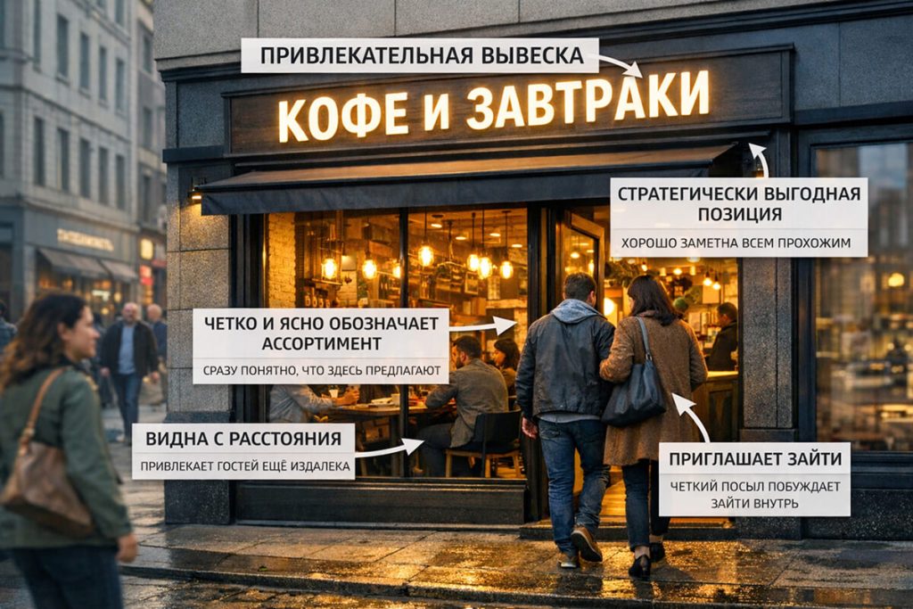 Правильный выбор вывески — это не спор о вкусе, а управление конверсией с улицы. Сильная вывеска должна быть короткой, понятной, читаемой и коммерчески полезной. Если выбирать по этим критериям и проверять по цифрам, она начинает работать как полноценный канал привлечения гостей.