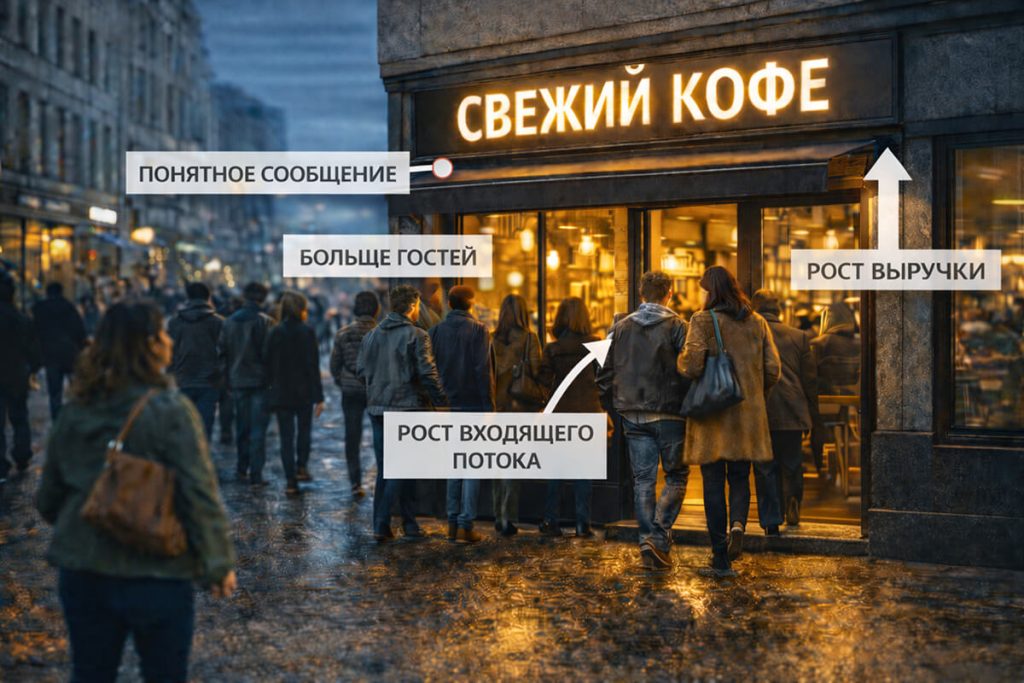 Сначала определяем, какую задачу решаем. Узнаваемость бренда, ланчевый трафик, вечерний поток, семейные посадки, продажи навынос — это разные сценарии, и под каждый нужна разная коммуникация.