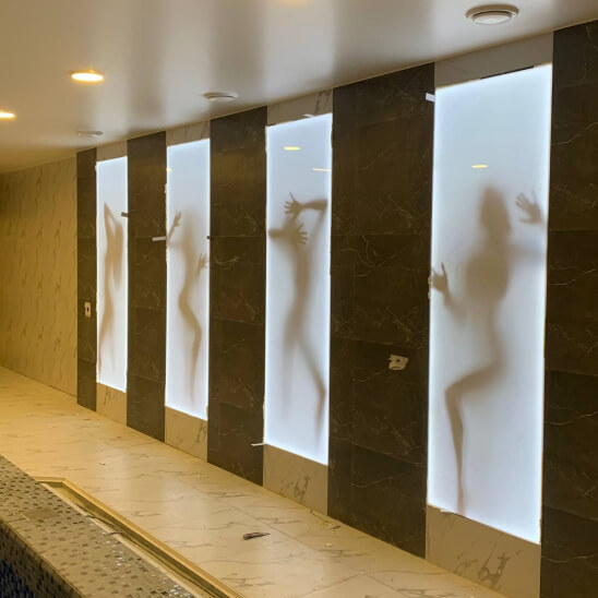 Это популярный, стильный и универсальный вариант для брендирования точек продаж и наружной рекламы различных компаний. Лайтбоксы с инкрустацией устанавливают как в интерьере ресторанов, гостиниц, офисов и магазинов, так и снаружи зданий в качестве вывески или обшивки козырьков. Также световой короб может выступать инструментом навигации на остановках, пешеходных зонах и других местах. Заднюю сторону конструкции изготавливают из ПВХ-пластика толщиной 5 мм, а лицевую — из композитных материалов и оргстекла толщиной 10 мм. Светодиоды вставляются в специальные фрезерованные отверстия внутри короба.